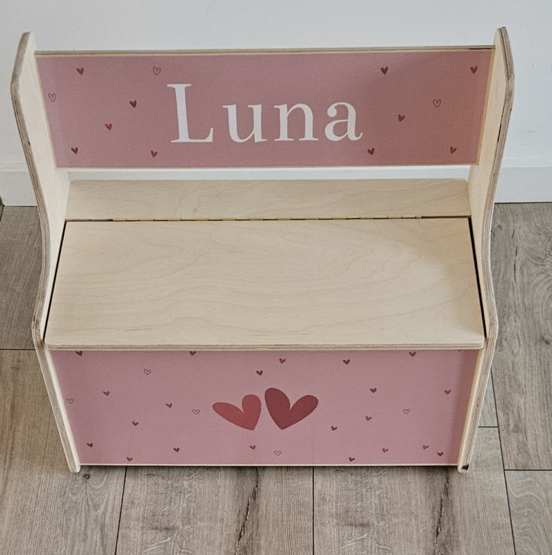 Onze houten opbergbank met hartjes-print wordt speciaal gemaakt met de naam (en geboortedatum).