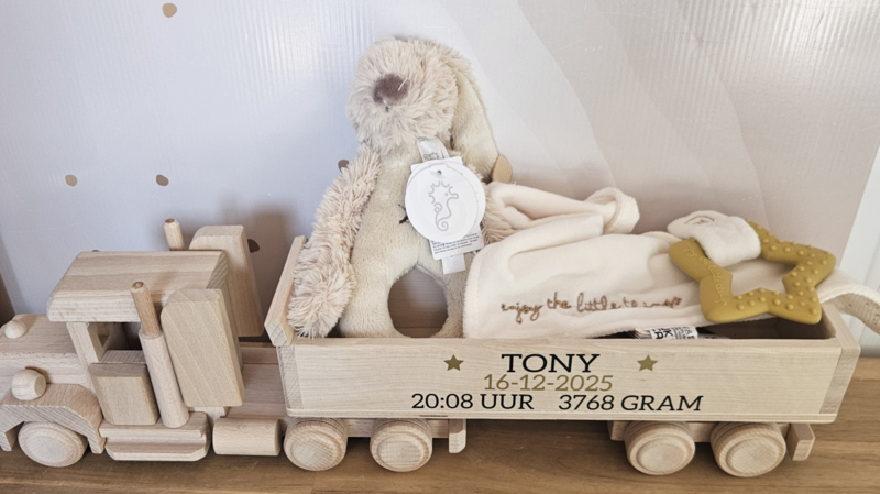 OverzichtGevulde houten Amerikaanse vrachtwagen met oplegger (met naam en geboortegegevens)