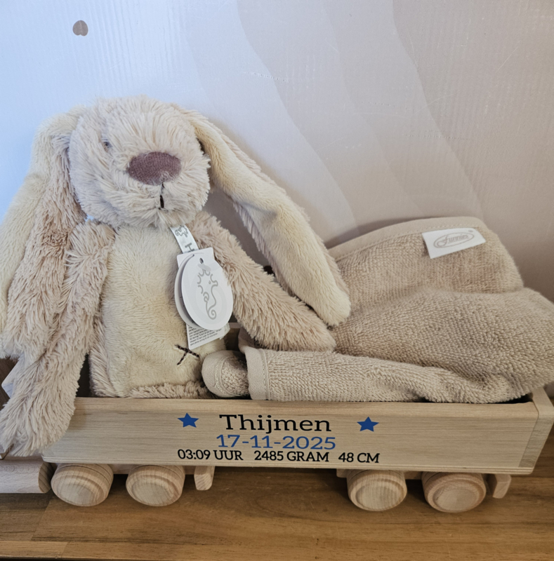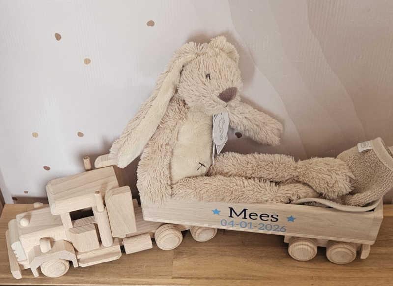 OverzichtGevulde houten Amerikaanse vrachtwagen met oplegger (met naam en geboortegegevens)