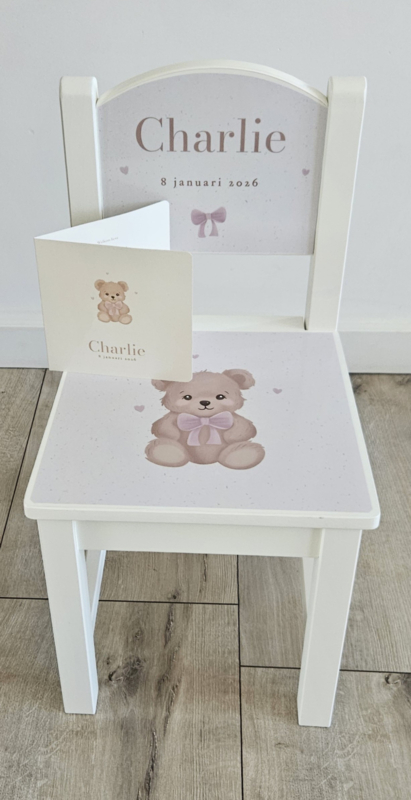 Wij maken voor u het ontwerp, u hoeft zelf niets te doen en alleen maar het kaartje toe te sturen, het maakt niet uit of een kaartje rechthoekig of langwerpig is , onze ontwerper maakt het precies op maat zodat het mooi op het stoeltje past. Wij plaatsen automatisch naam en geboortedatum op het stoeltje, ook al staat de datum aan de binnenzijde van het geboortekaartje. Wilt u eerst een voorbeeld per mail van ons ontwerp voordat we het maken? Ook dat is mogelijk. Het kaartje krijgt u weer terug samen met het stoeltje.