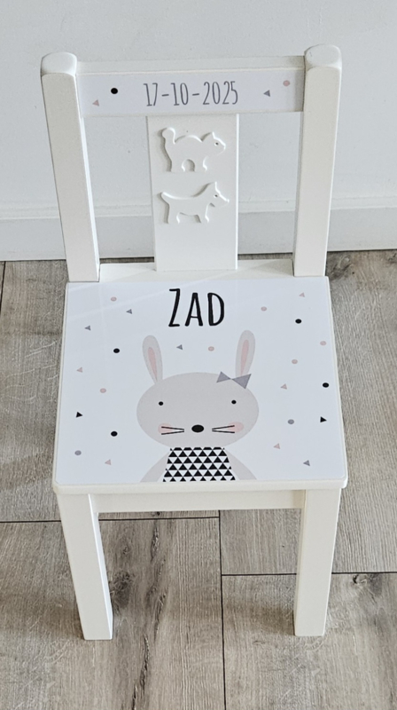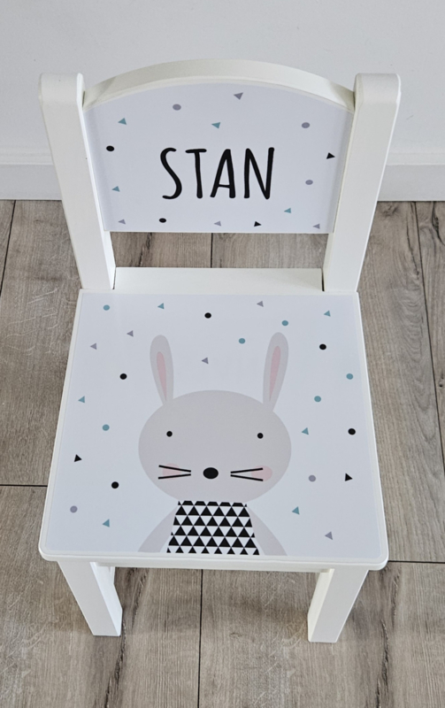Artikelnummer: 014 OverzichtStoeltje met naam en trendy konijntje
