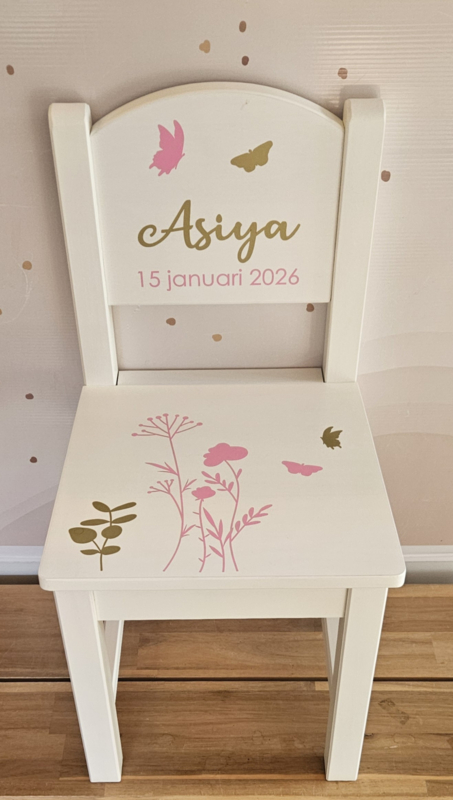 Stoeltje met naam en afbeelding van veldbloemen met vlinders.