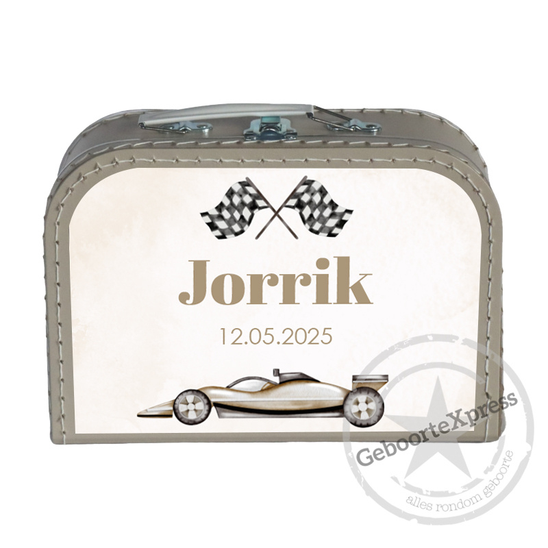 Dit leuke koffertje met naam (en geboortedatum) en de afbeelding van een formule 1 racewagen met vlaggen.
