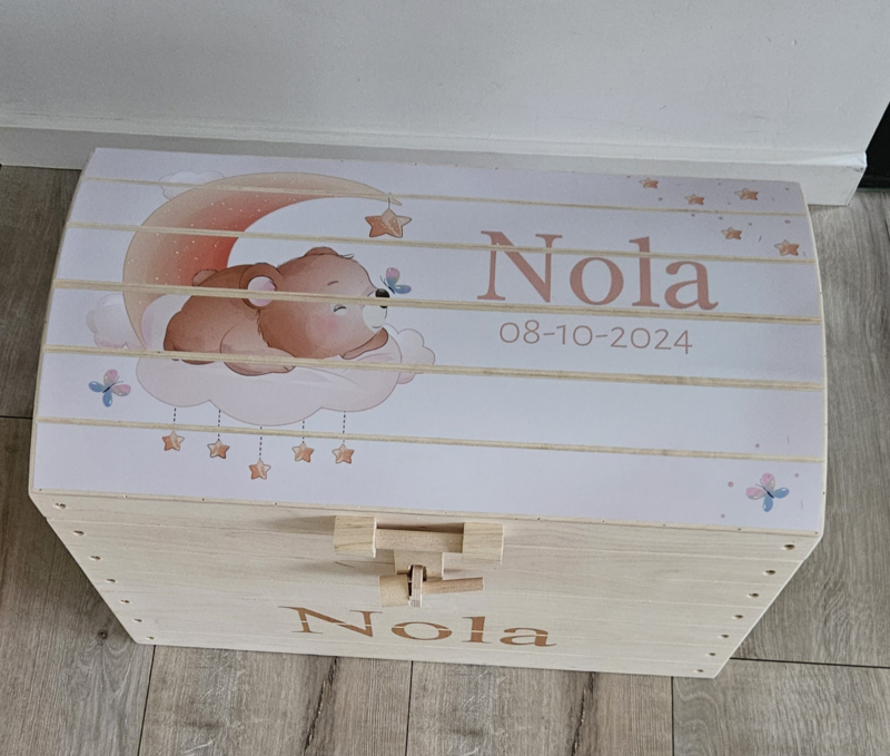 Deze kist is met een print van een schattig beertje op een wolk en de maan met roze accenten.