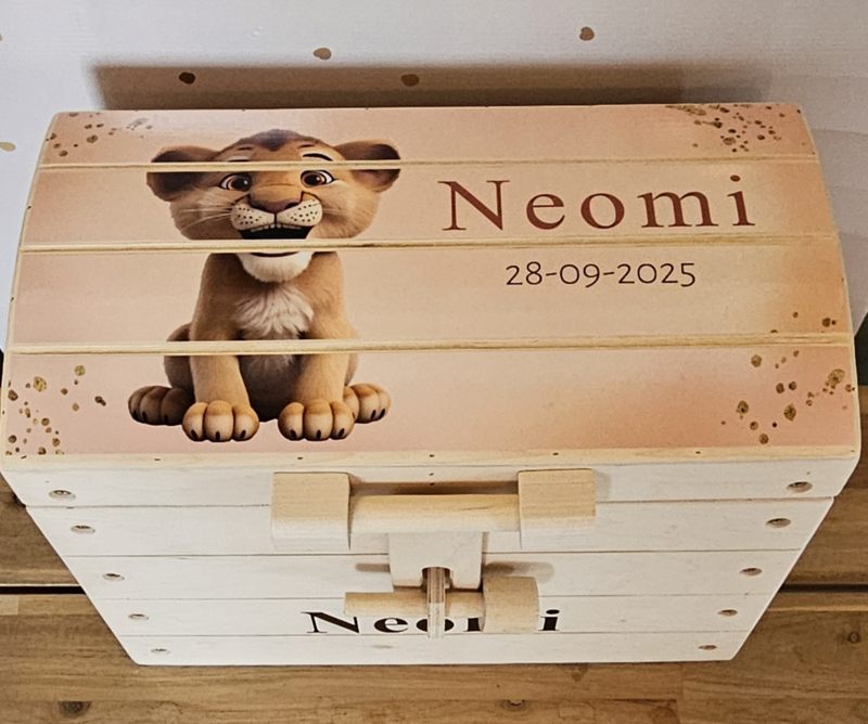 Houten speelgoedkist met naam Schattig Leeuwtje beige