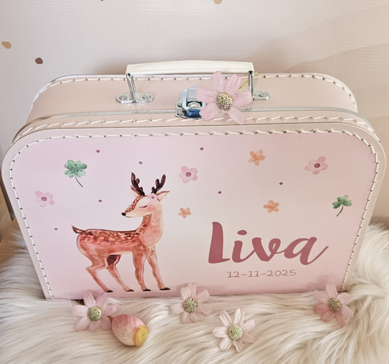 Dit leukekoffertje met naam en een hertje is verkrijgbaar in diverse kleuren en afmetingen.
