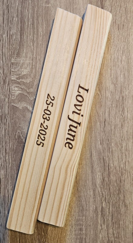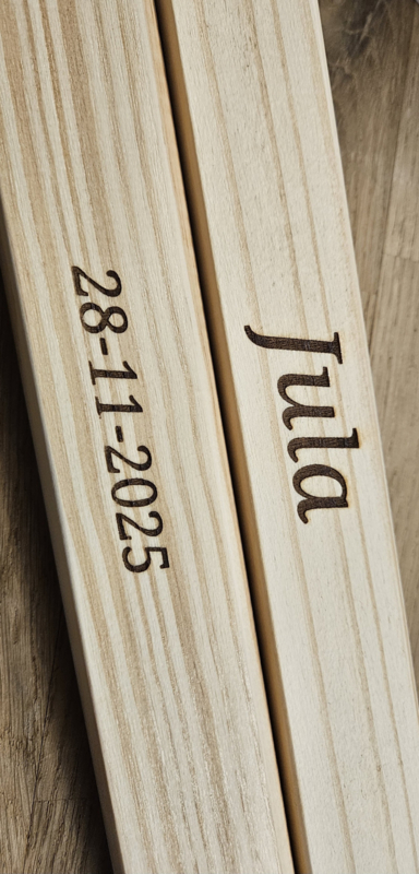 De naam en eventueel datum worden in het hout met een laser gegraveerd.