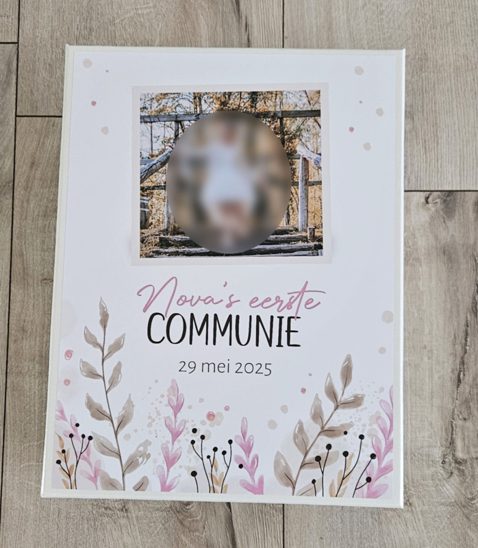 Artikelnummer: 017 communie OverzichtCommuniedoos met naam en ''foto leaves pink''