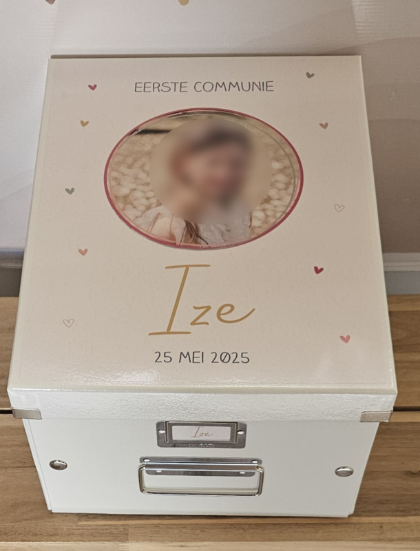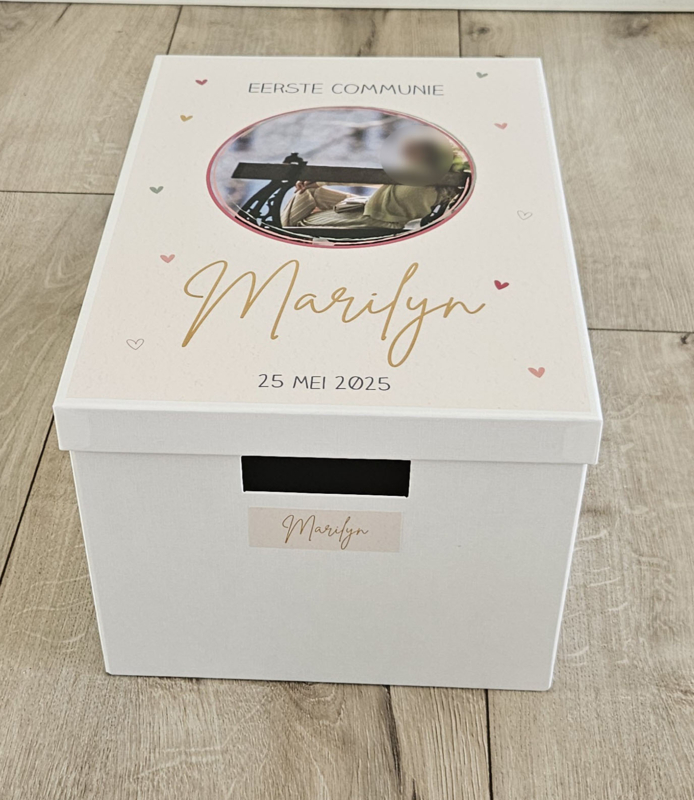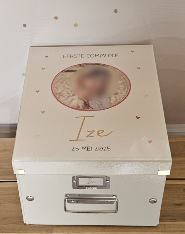 Leuke communie bewaardoos met naam voor de 1e H. Communie ter herinnering.