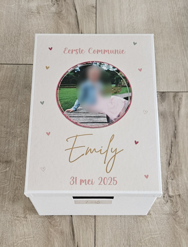 Communiedoos met naam en ''foto pink hartjes''