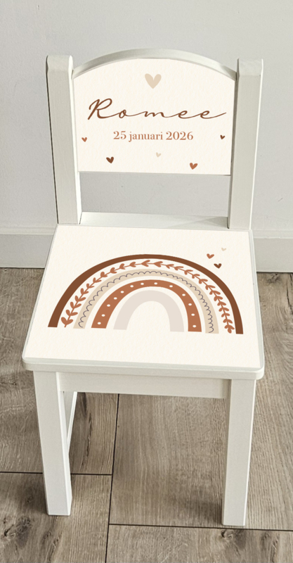 Daarnaast bieden wij een super unieke optie: het stoeltje kan volledig gepersonaliseerd worden met het geboortekaartje van het kindje. Zo ontstaat een prachtig, persoonlijk kunstwerk dat een blijvende herinnering vormt – een absoluut eyecatcher en favoriet cadeau.